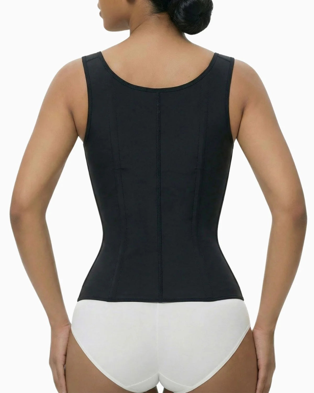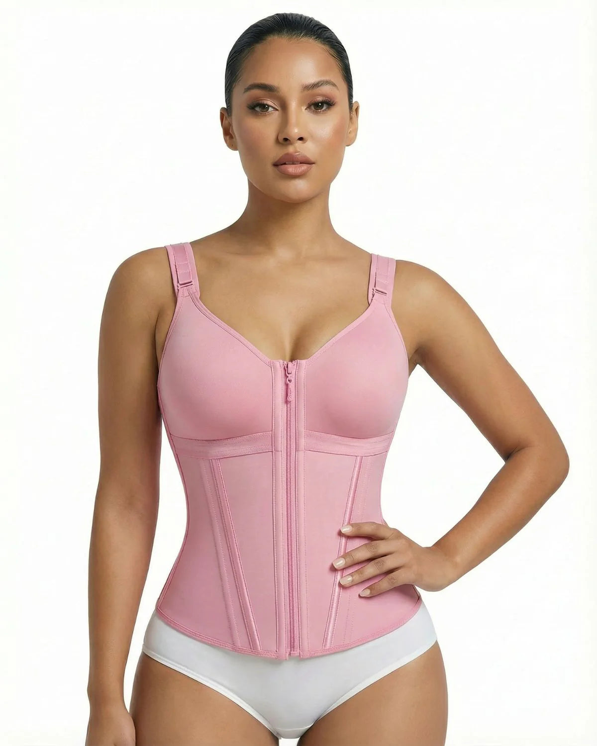 Sistema de cierre dual (gancho frontal + cremallera lateral) que permite elegir el nivel de compresión sin esfuerzo. Firme, pero cómodo.